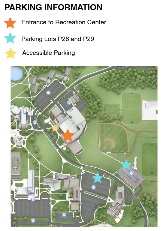 Parking: Free parking is available on campus. The closet lots are P26 and P29. From there, please follow PRRF signage to the Recreation Center. There is limited accessible parking directly in front of the Recreation Center.