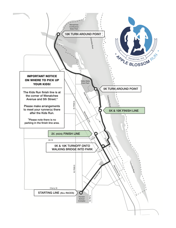 The starting line for all events is at the Cherry and Orondo Streets crosswalk.