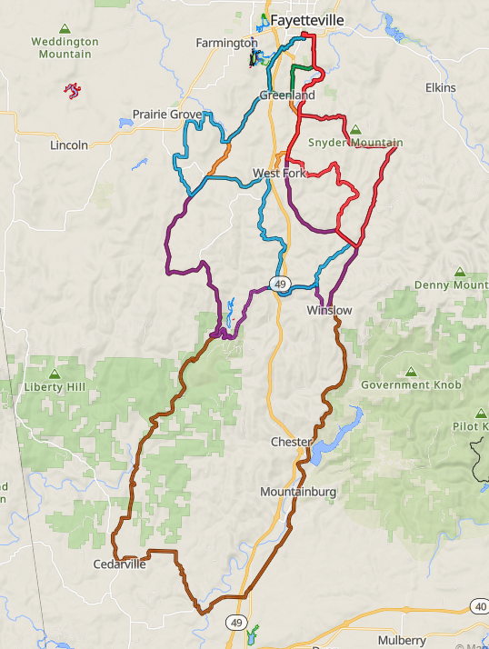 65 mile - This is the same route used by the UCI Men and Women during the Joe Martin Stage Race (except for the last couple miles to the finish). It takes you south on Hwy 71 through Winslow and into Devil's Den State Park. After the switchbacks and climb out of Devl's Den you will loop back into Fayettteville through Hogeye.