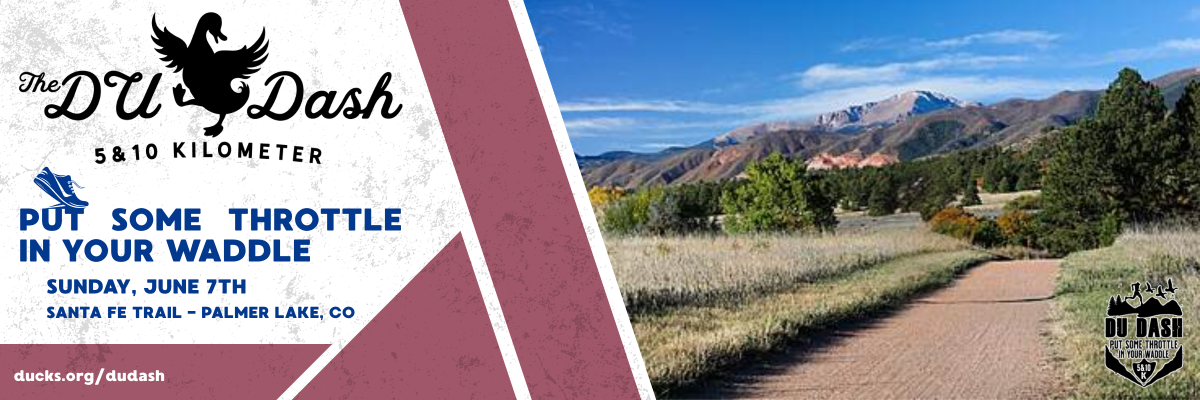 Experience the awe-inspiring beauty of Colorado's Palmer Lake area on the Santa Fe Trail for the in-person DU Dash. Runners will traverse the trail framed by the Rocky Mountains, connecting with nature while supporting wetland conservation efforts. Join us for a memorable journey through stunning vistas and pristine wilderness, where every step taken contributes to preserving our natural heritage.