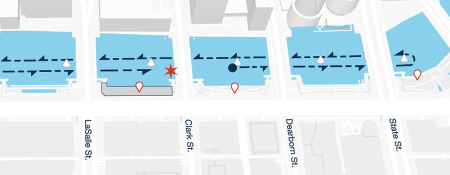 - 2-Mile: Long course swimmers will complete two counterclockwise loops around the perimeter and finish at the River Theater under the Clark Street Bridge.