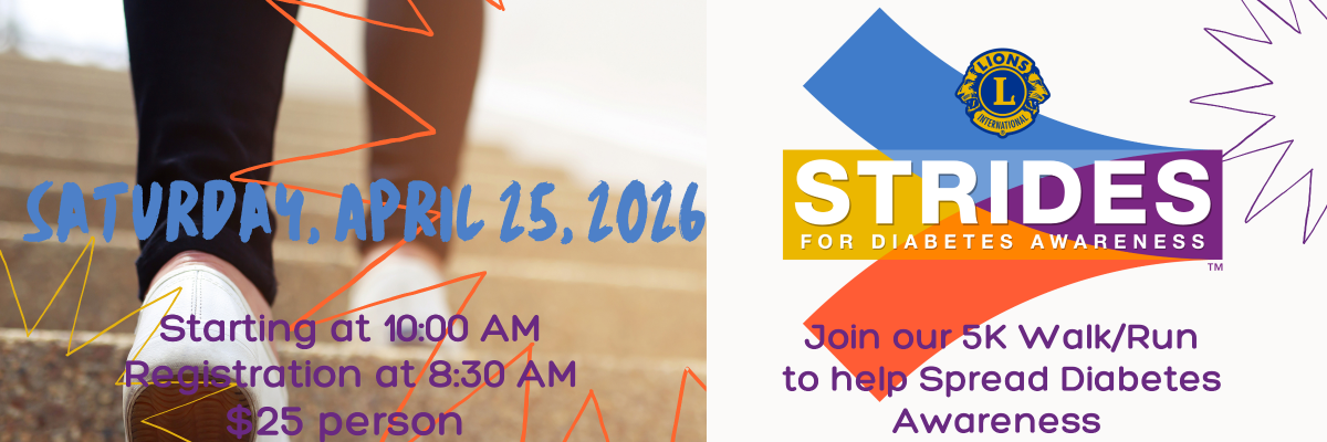 The Walk/Run will be held on Saturday April 25th, 2026, at 10AM. Registration/ Race check in will be on Friday, April 24th, from 5 PM to 7 PM and on the morning of the race (April 25th, 2026) starting at 8:30 AM. This event is to help promote awareness of Diabetes in our community and all proceeds will benefit the Lions Club International Foundation. The Run/Walk will be $25 per person (prices may vary with online registration). Each participant who registers by Friday, April 17th, 2026, will receive a  T-shirt with the STRIDES logo and the event information on it.