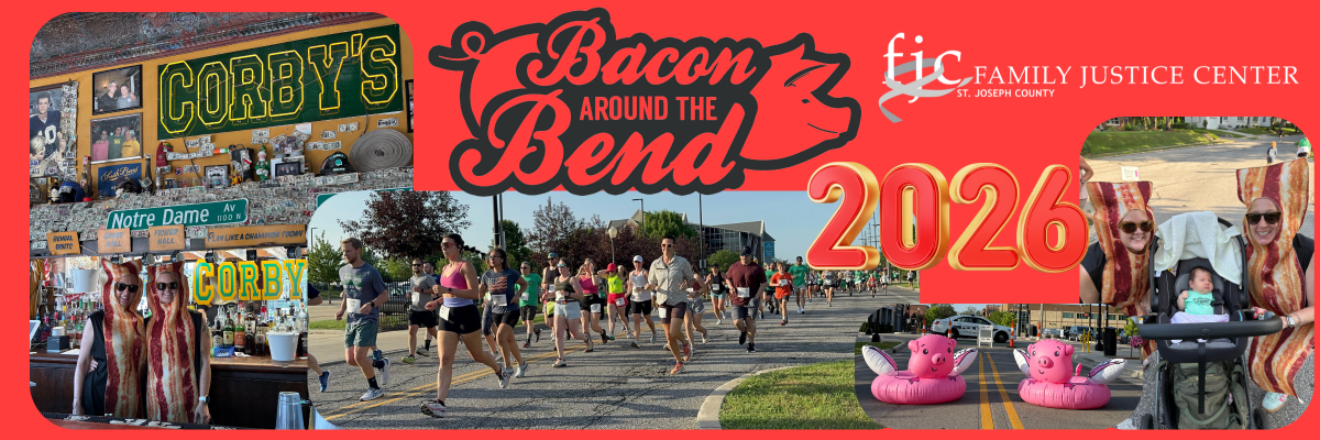 Join the Family Justice Center on Saturday, June 27, 2026 for the 9th annual Bacon Around the Bend 5k! This scenic downtown 5k will once again feature our famous BACON STATION at the halfway point along the route. All finishers are invited to celebrate their achievement with post-race bacon-themed snacks at a finish line party hosted at Corby's Irish Pub. Participants over the age of 21 will also have the opportunity to toast their achievement with festive libations including our signature Bacon Bloody Mary.