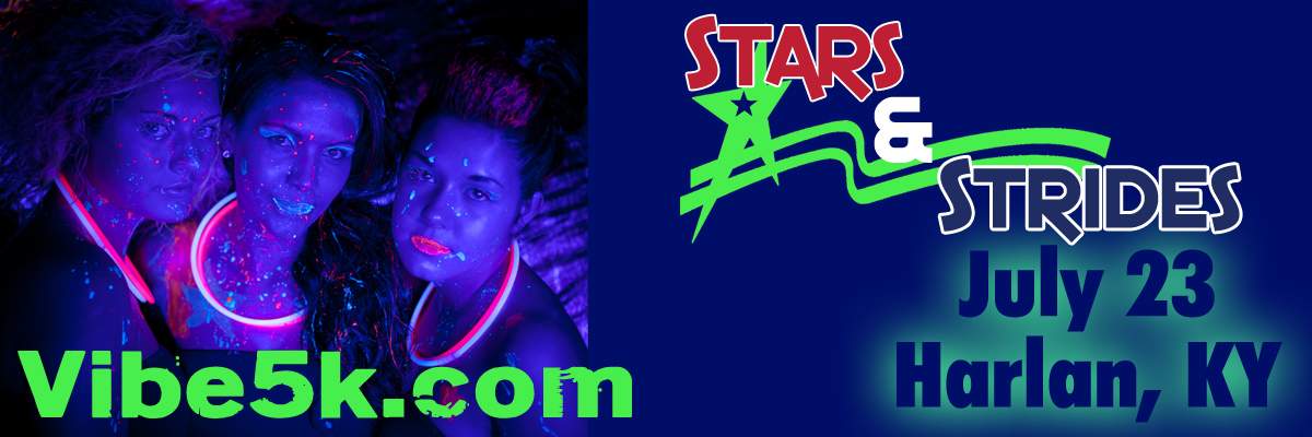 Welcome to our race registration site! Vibe 5 presents Stars & Strides, America's 5K Freedom Run! It's fun for the entire family! Come and celebrate our nation's freedom with us on Saturday July 23rd in downtown Harlan KY. This will be a timed 5K glow run on the downtown route complete with inflatable red, white and blue inflatables, paint, powder and a black light tent. Medals will be given in 10 year men and women age group categories. Kids 10 and under run free with a paid adult. Some restrictions apply. A portion of the proceeds will benefit Hospice Of The Bluegrass!