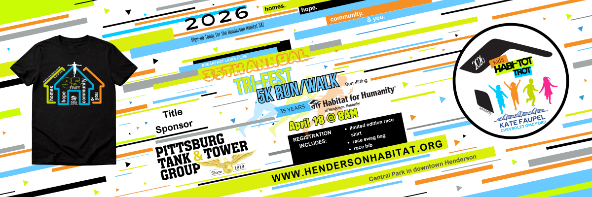 The 35th Annual Breakfast Lions Club Tri-Fest 5K Run/Walk benefiting Habitat for Humanity of Henderson, KY will be on Saturday, April 18, 2026. This race will take place at Central Park downtown by the riverfront and start at 8am rain or shine! This is a certified 5K race route with medals and awards given out after the race. Pre-Registration bag includes a 35th Anniversary and 100th Home Limited Edition Tri-Fest 5K shirt, custom bib and swag bag full of additional goodies while supplies last. Habitat for Humanity will also be hosting the 9th Annual Habi-Tot Trot Kids Dash at 7:40 for kids ages 7 and under.