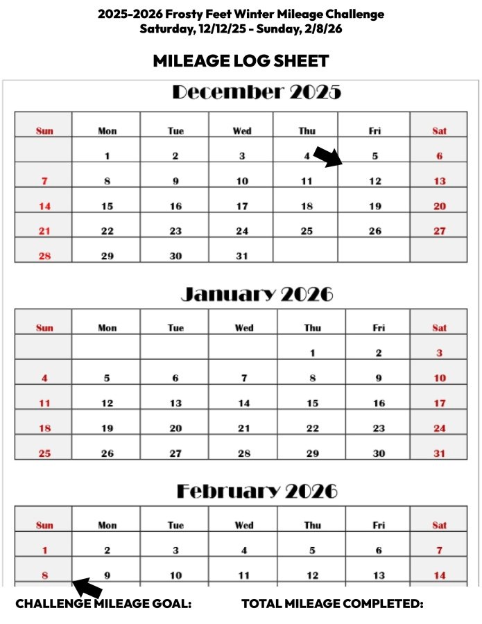 Run, walk, hike, tread or swim 26.2, 50, 100, 150, 200, 250, or 300 miles between December 12, 2025 and February 8, 2026. You've got 58 days to get your miles whether you log 1, 2, or 3 miles/day or do it in larger segments. The challenge officially runs from Friday, December 12th through Sunday, February 8th however you can start after 12/12/25 if you wish. It's all about providing you some motivation to keep moving this winter.