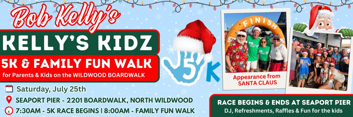 Join us for the 4th annual Kelly’s Kidz 5K and Family Fun Walk on the Wildwood Boardwalk! This year’s race takes place during Christmas in July weekend and Santa will be there! So wear your Christmas gear, dress the family, and kick off your Christmas in July festivities while supporting a great cause!