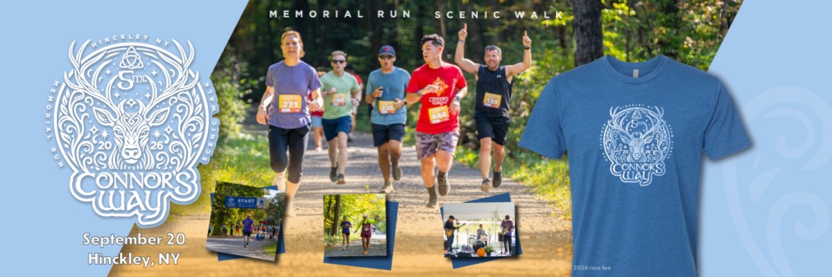 Come follow in Connor’s footsteps on a beautiful scenic five-mile wooded trail in the foothills of the Adirondacks. Celebrate the beauty of nature as you run or walk through five miles of seasonal roads and trails. Follow in the shadow of the young man who loved to run around the lake and the woods of Hinckley for the love of running. Celebrate life, nature and community as you help fund a memorial and scholarship in Connor’s name, touching lives of future local doctors. This is “Connor’s Way”…