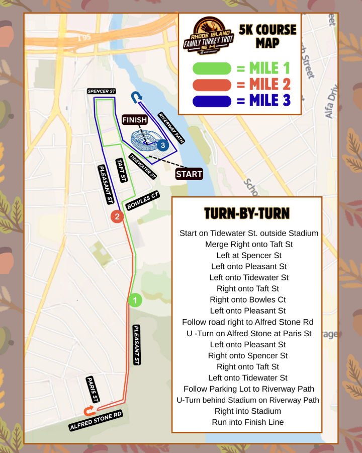 Event date is Thursday, November 27, 2025 at beautiful Centreville Bank Stadium in Pawtucket, RI! Participants in the 2025 race will enjoy an epic on-field finish inside the Stadium and afterwards, we hope you’ll join us for a drink inside The Club overlooking the field (credit card only). 5K starts 10:00 a.m. Youth run for kids aged 12 and under starts at 9:30 a.m. As always, parents are welcome to run with their children. Walkers always welcome!