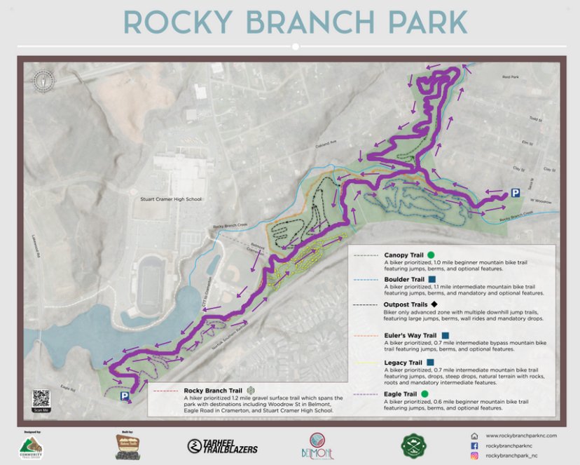 - Race Route: The route will start at the main entrance on the Belmont side of the park. Runners will begin down the main Rocky Branch Trail, connect through the Canopy trail, and loop back before the parking lot on the Cramerton side of the park before returning on the Rocky Branch Trail to the finish line near the parking lot.