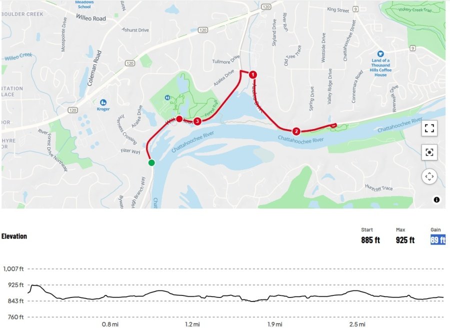 The Course will start .25 of a mile back of Chattahoochee Nature Center running east on Willeo road. The course will make a right on to Azalea drive following Azalea to the turn around at the NOC, The course will head back to Chattahoochee Nature Center finishing in front of the Nature CenterĀ