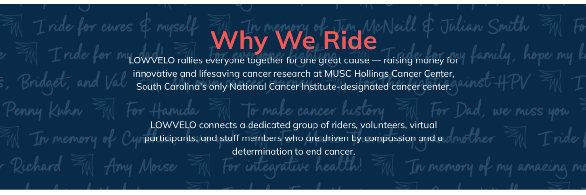 LOWVELO / [ low·vel·oh ] / Noun. A combination of the words Lowcountry and velo, the French word for “bike.” A cycling event that brings a dedicated group of riders, volunteers, virtual participants, sponsors and staff members together to raise funds for innovative and lifesaving cancer research at the state’s only National Cancer Institute-designated cancer center: MUSC Hollings Cancer Center in Charleston.